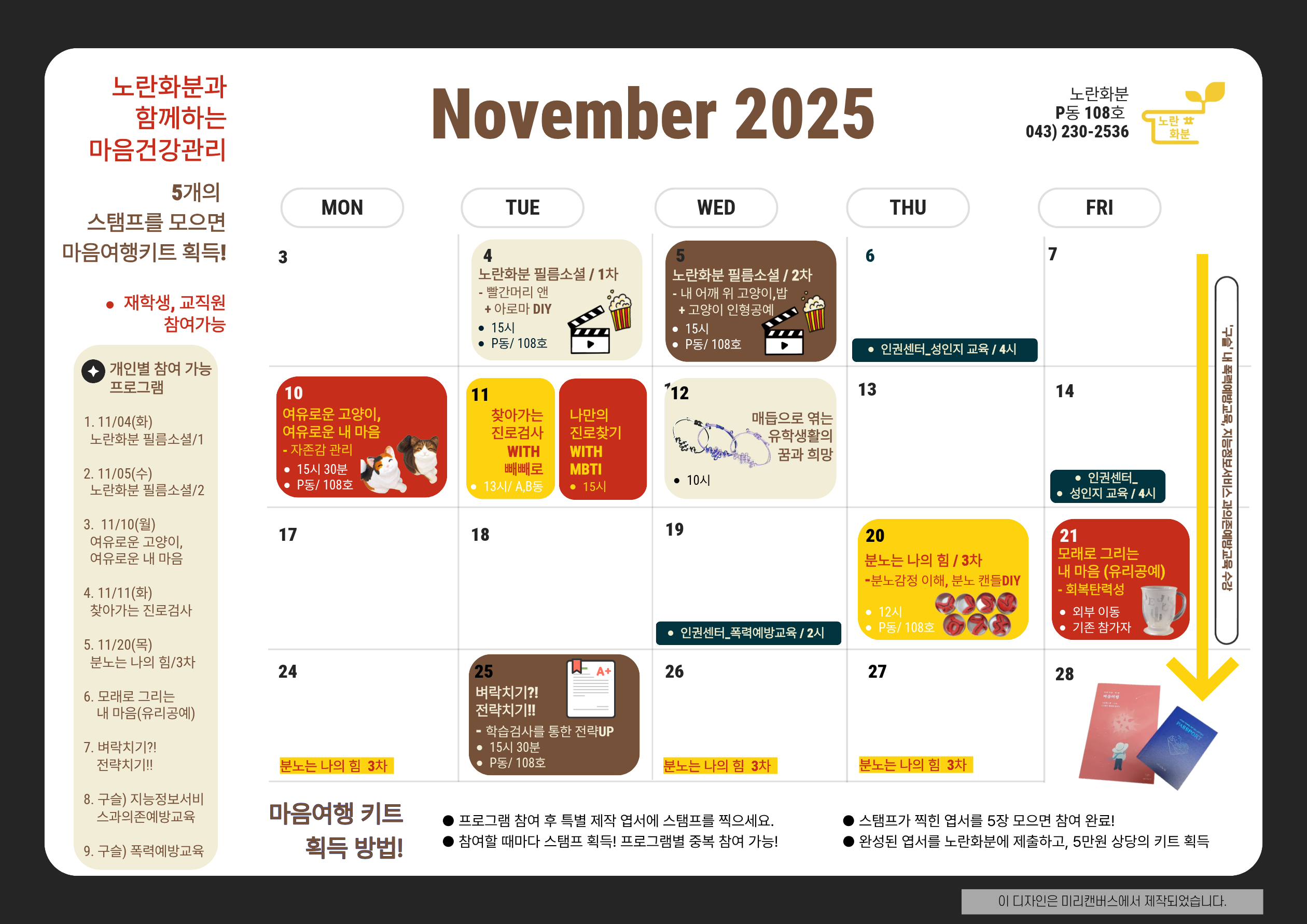 [노란화분] 노란화분과 함께 11월 마음건강관리!! 5개의 스탬프를 모으면 마음여행 키트 획득!! (프로그램 참여 구글폼 링크는 공지글 하단에 작성)