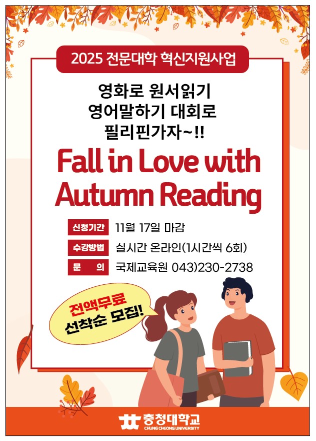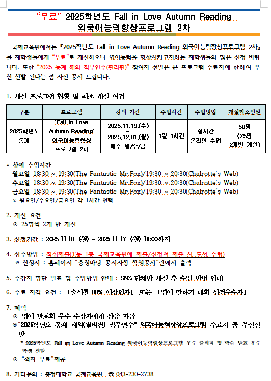 학생공지 학생공지 일반공지 장학/학자금 공지 감염병안내 공모/모집/시험 도서관 생활관 기부금공개 업무추진비공개 보육교원연수원 기타공고 충청대학교_대표-학생공지(대표_충청마당_공지사항_학생공지) 상세보기 - 제목, 내용, 파일, 작성자, 조회수, 작성일, 학과공지, 주소링크 정보 제공 2025학년도 "❤️Fall in Love Autumn Reading 외국어능력향상프로그램2차❤️" 안내 작성자 : 김아진 작성일 : 2025-11-13 조회 : 116 . 파일 jpg 문서 포스터.jpg hwp 문서 2025학년도 외국어능력향상프로그램 개설 안내문.hwp hwp 문서 2025학년도 외국어능력향상프로그램 참가신청서.hwp png 문서 12345.png 주소링크 목록 게시물삭제 광고 반복작성 욕설 본인삭제 게시물삭제 이전글 [교수학습지원실] 교과·비교과 과정설계 공모전 참가신청 안내 다음글 2025학년도 2학기 중간 강의평가(간호학과 블록수업) 설문 실시